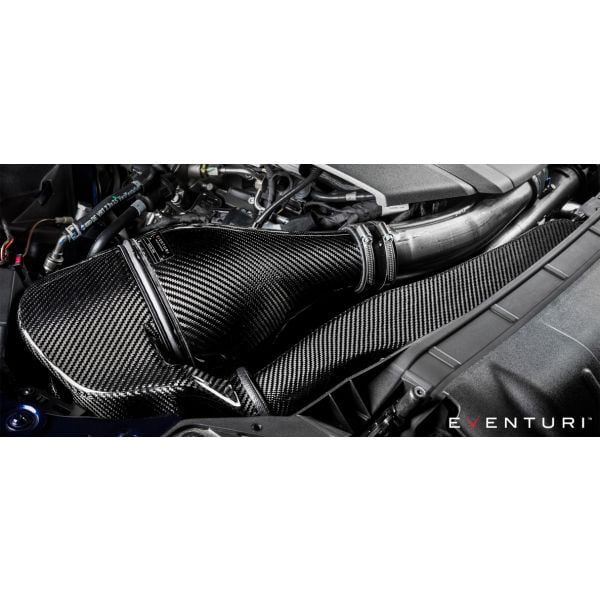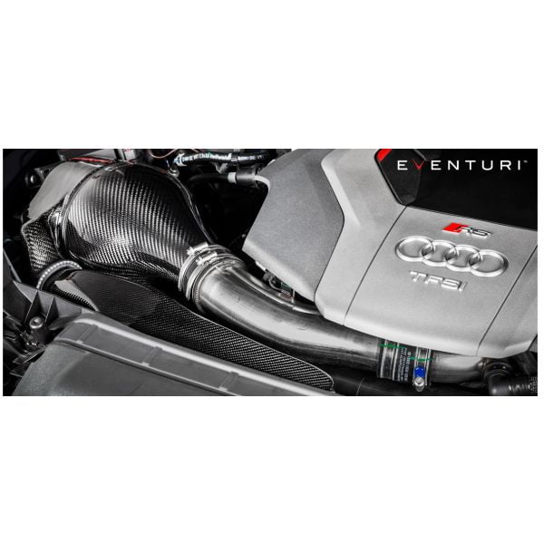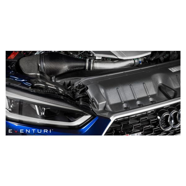 The Audi B9 RS4/RS5 Eventuri intake was developed to give less restrictive airflow to the turbo whilst maintaining low inlet temperatures. The RS5/RS4 engine bay becomes heat soaked very quickly so simply having an open cone system would result in better airflow but with higher inlet temperatures. We therefore completely re-engineered the inlet track from the turbo inlet pipe to the front grill with a highly efficient sealed system. The restrictive stock airbox and flexible plastic inlet pipe have been replaced with a Venturi filter housing and a duct system with smooth transitions. Furthermore, by removing the convoluted stock inlet pipe and replacing it with our one-piece Venturi housing and solid tube, the airflow is much smoother as it enters the turbo inlet tube. The resulting performance gains and aesthetics are industry leading for this platform.